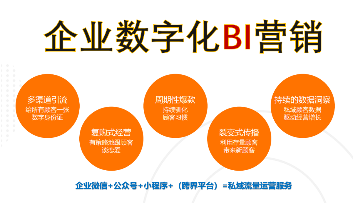 企业提供数字化BI营销服务,解决企业的拓客、裂变、复购销售、策略、跨界营销、业务追溯、分销分账等一体化运营