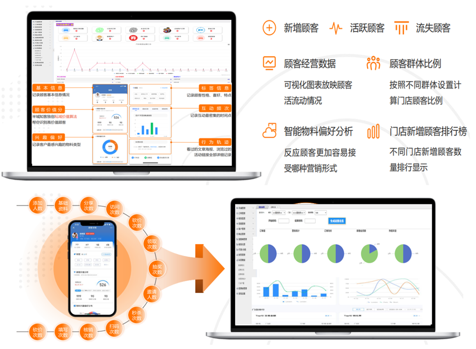 通过后台的运营数据汇总,快速形成新增顾客/活跃顾客/流失顾客/顾客经营数据/顾客群体比例……多个维度分析门店私域顾客现状;
